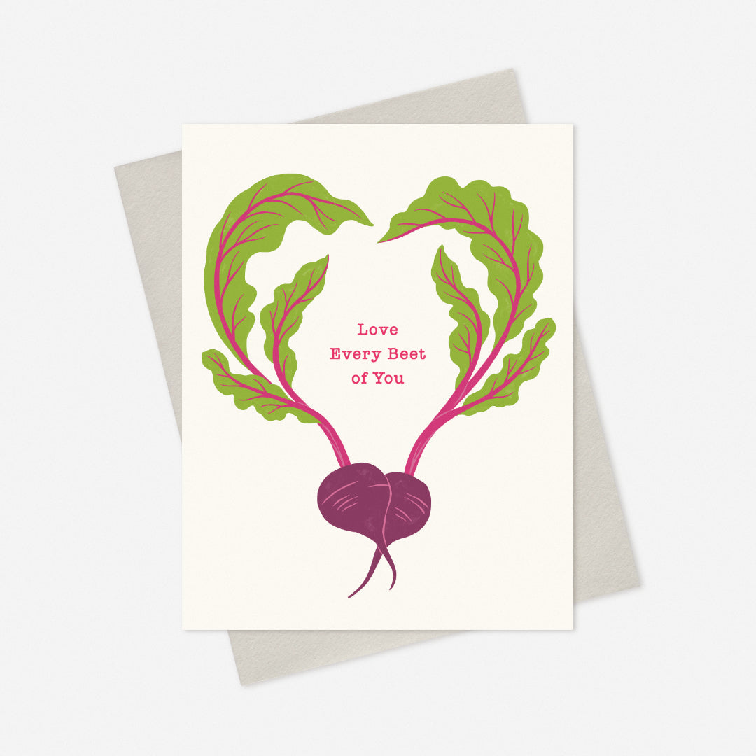 A whimsical garden-themed greeting card featuring beets shaped like a heart, with the sweet message inside: “Love every bit of you”. Prefect for anyone who enjoys a good pun, this card is a fun way to express love and friendship.
